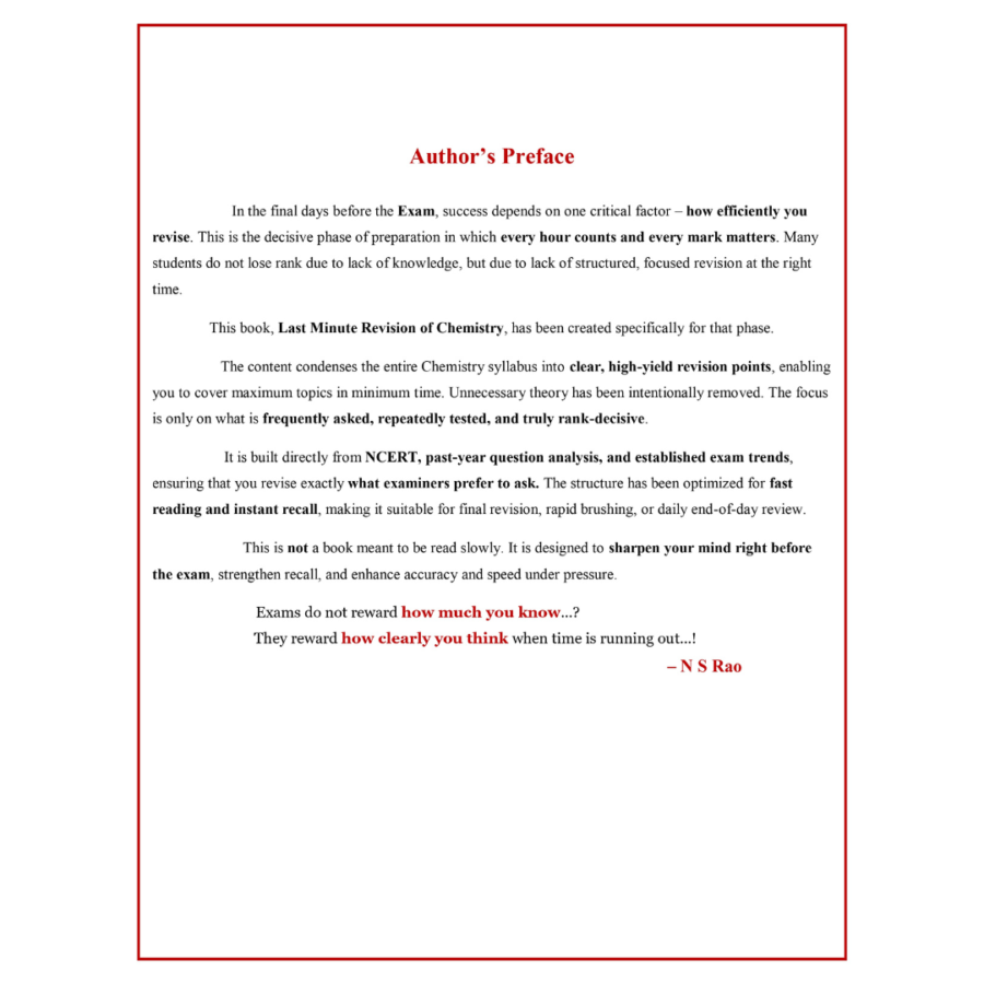 Prepare confidently for your NEET and JEE Main exams with the Last Minute Revision Book by NS Rao. This expertly crafted resource is designed to help students solidify their understanding and recall crucial topics in the final phase of preparation. With a focus on clarity and efficiency, this book ensures that you make the most of your study time and step into the exam hall with confidene.